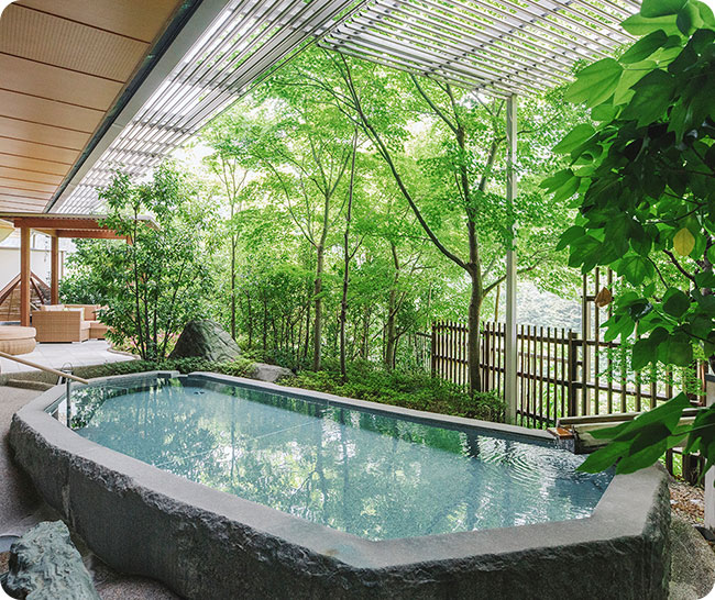 湯量の少ない半身浴では、浮力も少なくなってリラックス効果も半減。また、シャワーで済ませている場合は浮力の効果を得られません。お湯が豊富に湧き出る広々とした温泉で、首までしっかり浸かれば浮力の効果を堪能できます(息苦しく感じるときは無理せず半身浴にしましょう)。