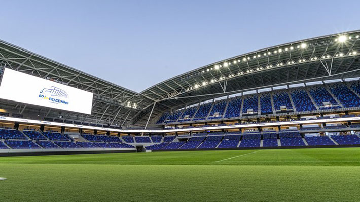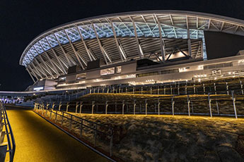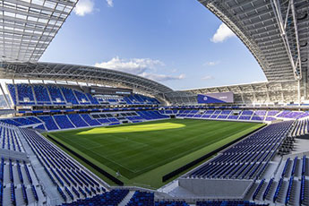 2024年に開場。広島市中心地から徒歩10分という好立地。全天候型で開放的な屋根を持つ今までにないスタジアムデザインが特徴で、ピッチまで最短約8mのスタンド設計などコンパクトで臨場感あふれるスタジアムを実現。