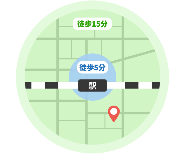 スマートフォンなどで検索する場合、たいていの人は「駅から5分以内」などの条件で探します。一方、「駅から15分以上」という条件で検索する人はあまりいないので、目につきにくい分、希望者が減り、家賃の値上がりが抑えられる傾向があります。また、図のように、駅を中心に徒歩5分圏内と15分圏内の二つの輪を描くと、その面積の差はなんと9倍!駅から遠くなるほど面積が広くなるので、供給される物件の数も増え、選択肢が広がります。