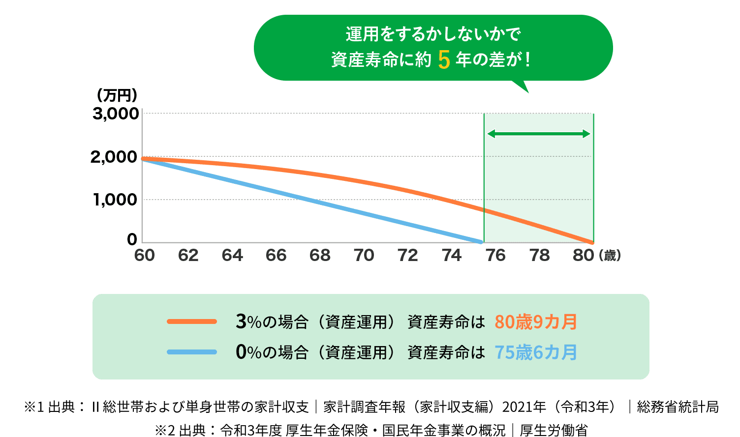 例えば、60歳の夫婦二人で退職金を含め資産が2,000万円あったとします。毎月貯蓄から約10.8万円を切り崩していった場合は75歳で資産寿命を迎えますが、同じ額を利用しながら年率3%で資産運用をした場合は、資産寿命を80歳まで伸ばすことができるのです。