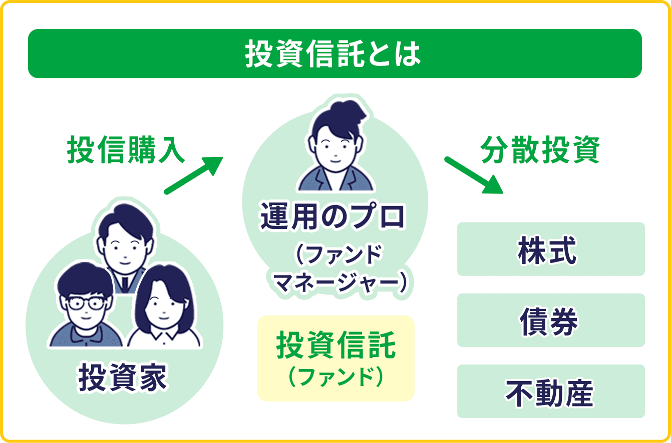 その①で述べた株式投資を、投資の専門家が株式や債券、不動産といったさまざまな投資先に分散投資をして運用するのを投資信託といいます。少額からでも投資することが可能で、豊富な知識や経験をもった専門家が、投資家の代わりにリスクを分散して運用してくれるため、初心者にも取り組みやすい資産運用と言えるでしょう。