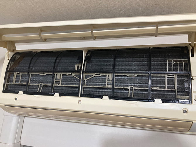 エアコンのフィルターを外すと、奥に銀色の薄い板が見えると思います。これが熱交換器で、汚れると嫌なニオイの原因になるだけでなく、熱交換の効率が低下して、余計な電力の消費につながる場合もあります。ただし、熱交換器の清掃は専門業者に依頼することをおすすめします。掃除道具などで圧迫してしまうと板が歪み、逆に運転効率の低下につながります。熱交換器の掃除が必要な場合には、エアコンの設置業者さんやエアコンメーカーの窓口に相談してみましょう。