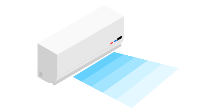エアコンの風向きは、冷房時には水平方向に設定すると効率的です。なぜなら、温かい空気は天井付近に、冷たい空気は床付近に溜まりやすい性質があるからです。もし風を下向きにすると、足元ばかり冷えて天井付近は温かいままに。多くのエアコンは室内機の吸い込み口付近(天井側)の温度を感知して運転を制御しているため、天井付近が温かいままだと「まだ部屋全体が冷えていない」と勘違いし、余分に稼働してしまうのです。これだと非効率で電気代もかさむことに。水平方向に風を送ることで冷たい空気が部屋全体に行きわたり、ムラが少なくなり、快適さと節電効果の両方が得られるので、お試しください。