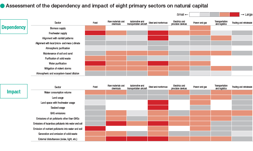 Also, we assessed the level of the dependency and impact of the eight primary sectors identified via the process described above by taking important types of natural capital for each sector into account. Drawing on the results of this assessment, we will engage in dialogue with each investee corporation to establish a shared recognition of nature-related risks and promote forward-looking initiatives to resolve such issues.