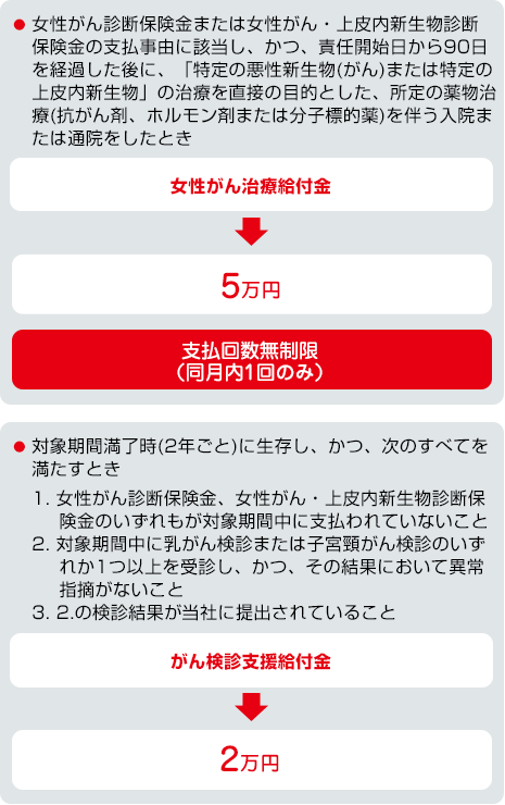 - 女性がん治療給付金のお支払いは、同月内1回を限度とします。