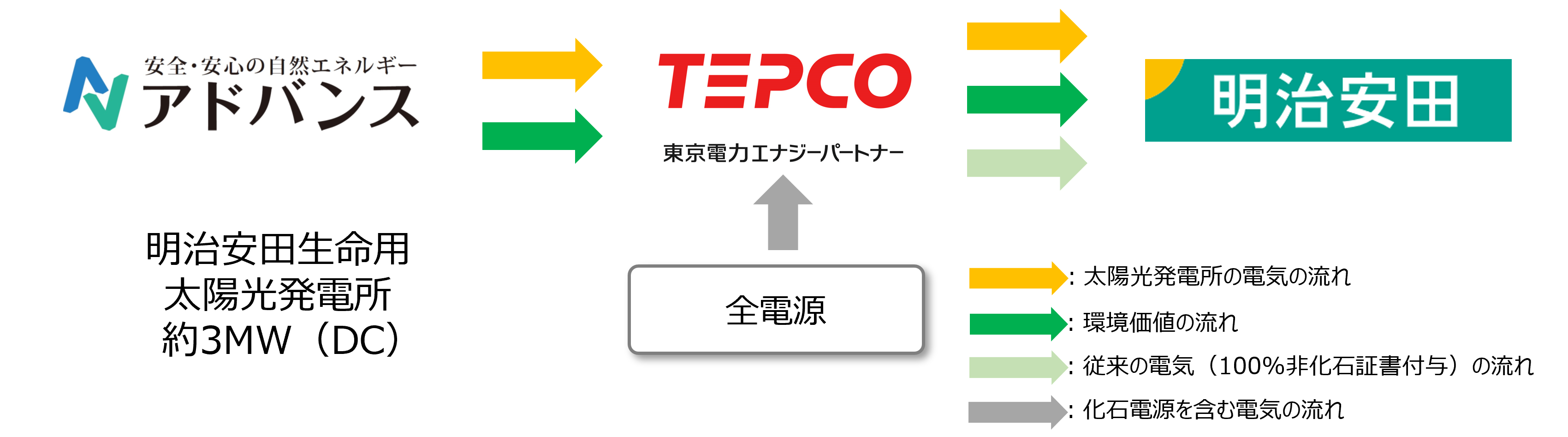 本取組みは、株式会社アドバンスが新設する太陽光発電所(総出力約3MW(直流))で発電する追加性※のある電力を、東京電力エナジーパートナー株式会社を通じて、明治安田生命ビル(明治生命館を含む)が供給を受けるものです。