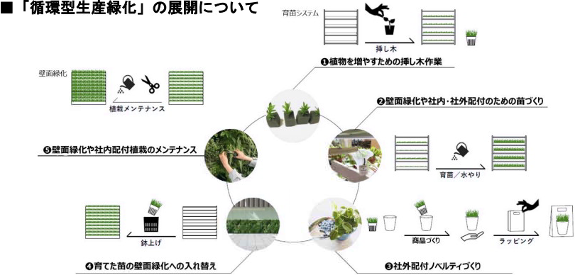 自社内で植物の生産活動と緑化活動を行なう「循環型生産緑化」に取り組んでいます。