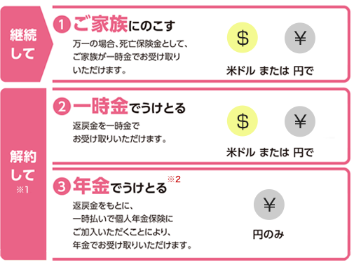 一生涯にわたる保障と将来の資金準備を兼ね備えた米ドル建ての終身保険です。 ※この商品には為替リスクおよびお客さまにご負担いただく諸費用があります。