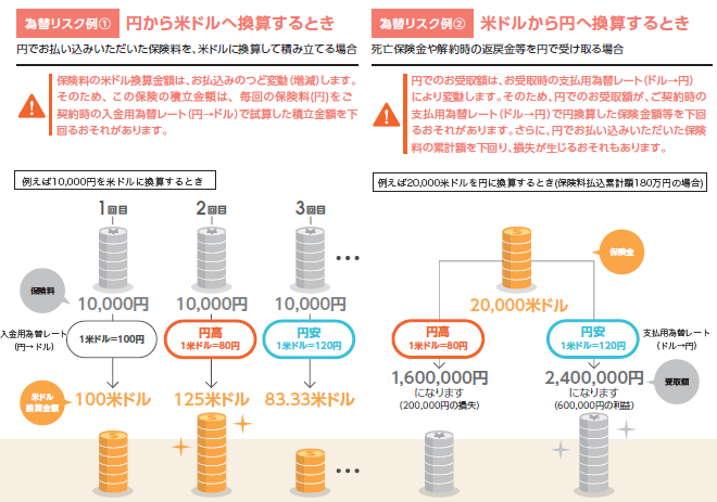 この保険における為替リスクは、ご契約者または死亡保険金受取人が負います。