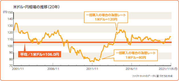 「長期間」少しずつ米ドルを購入することで、一般的に購入価額が平均化されるため、一括で購入する場合に比べ、為替変動の影響を軽減させる効果が期待できます。