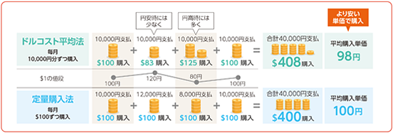 毎回「一定額の円」で米ドルを購入することで、毎回「一定額の米ドル」を購入する場合に比べ、平均購入単価を抑え、同じ円でより多くの米ドルを購入する効果が期待できます。