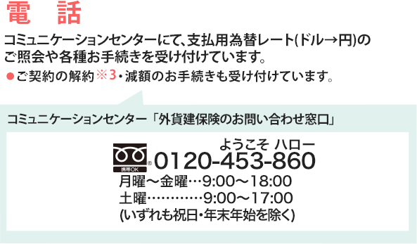●保険金等を円でお受け取りいただく場合の金額が、ご契約時の支払用為替レート(ドル→円)で円換算した保険金額等を下回るおそれがあります。さらに、円でお払い込みいただいた保険料の累計額を下回り、損失が生じるおそれもあります。